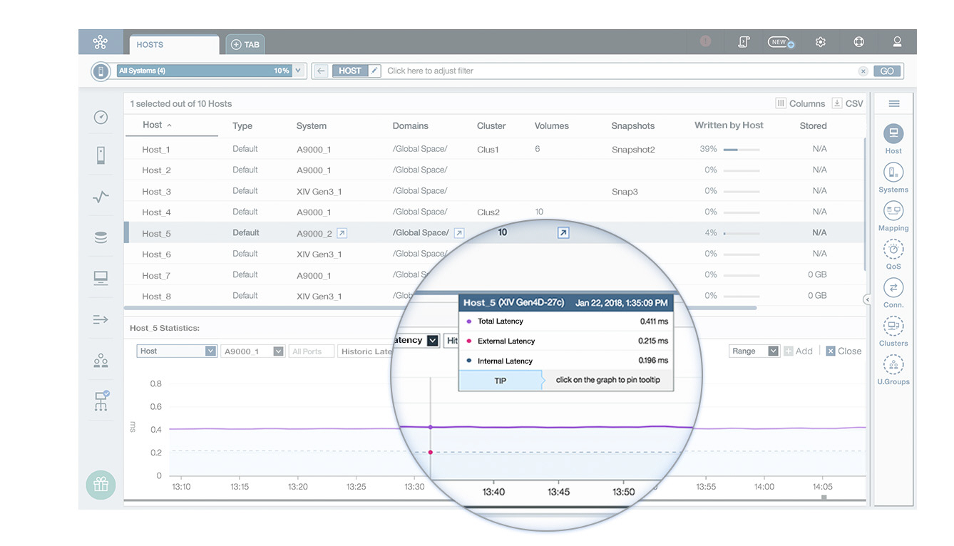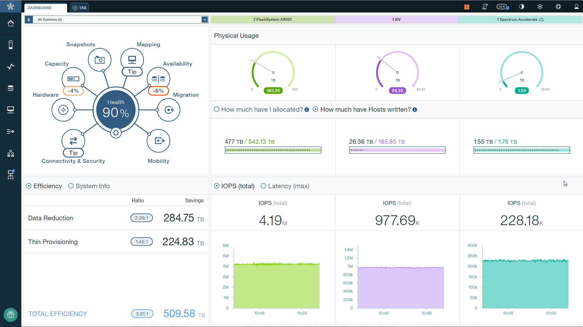 - 最简单,最直观的方法是通过GUI来显示当前的性能图标,比如IOPS, latency和bandwidth. 下面的例子可以看到两台A9000存储可以达到4M IOPS. 一台XIV可以达到接近1M IOPS,